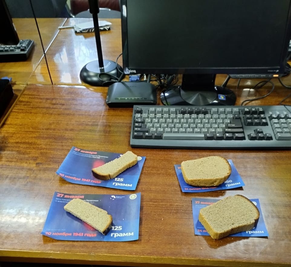 Волонтёры победы рассказали о подвиге блокадников, показали блокадные хлебные карточки. Каждому пришедшему на встречу достался маленький кусочек хлеба.