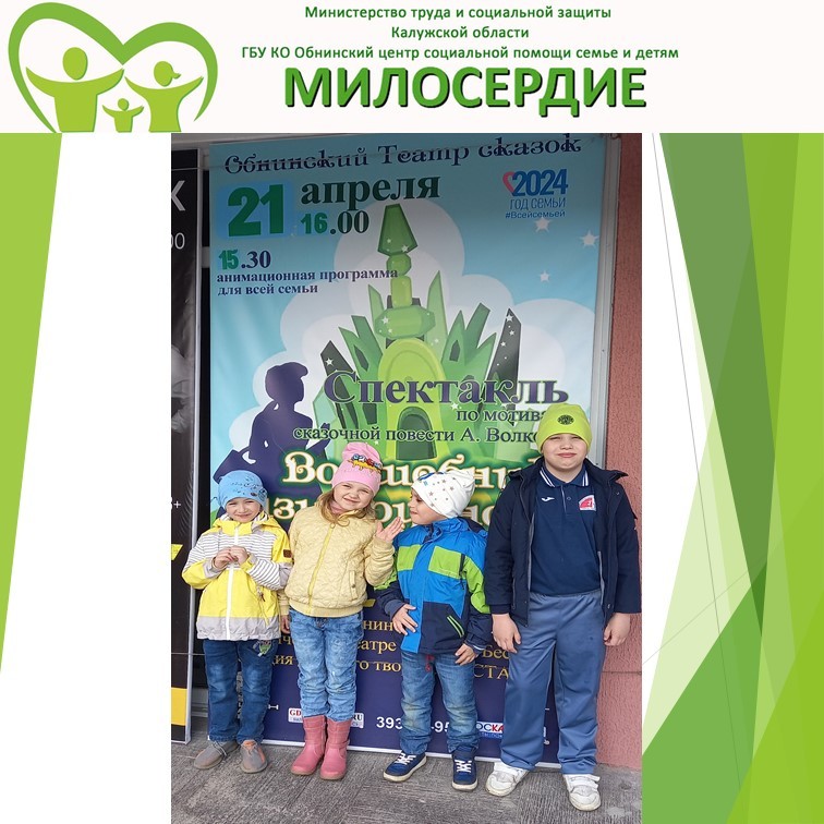 21 апреля воспитанники Центра «Милосердие» посетили Городской Дворец Культуры, где посмотрели премьеру фантазийной музыкальной сказки для всей семьи – «Волшебник изумрудного города». Спектакль о храбрости, смелости, доброте и дружбе, которые помогли победить коварство и зло.
