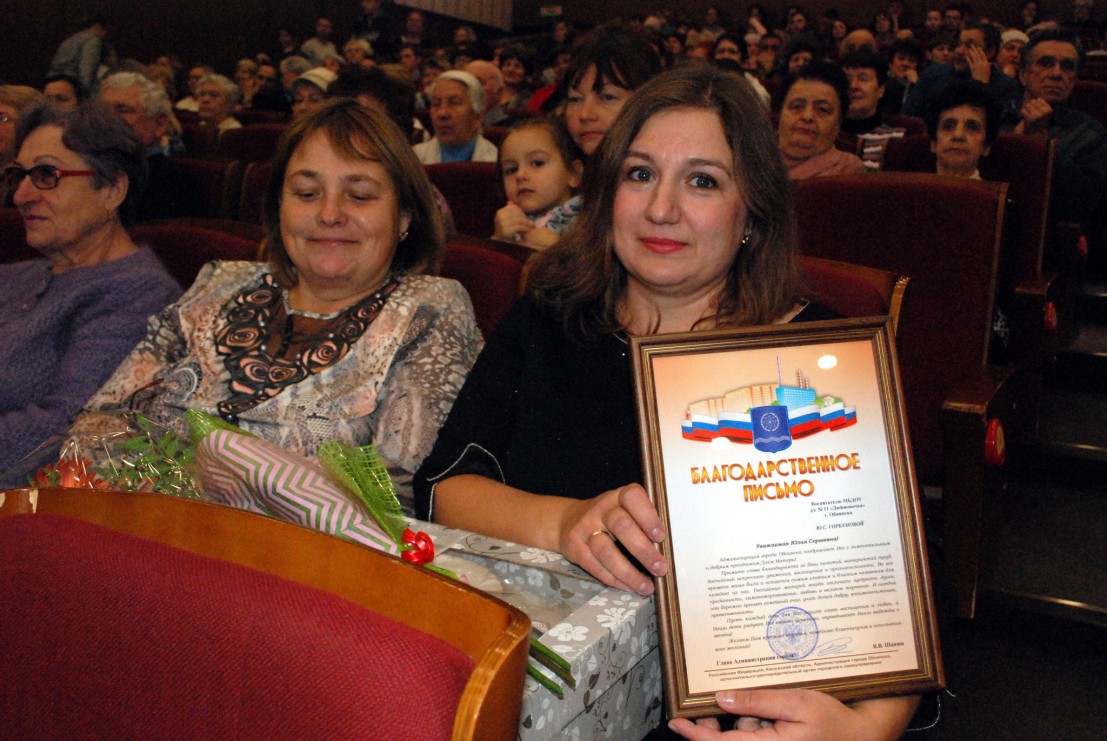 Благодарственными письмами Администрации г. Обнинска награждались мамы, достойно воспитывающих своих детей, представленные к награждению ОНПП «Технология», ПАО ПЗ «Сигнал», детскими садами, школами и другими Обнинскими организациями и предприятиями. Кроме того по сложившейся доброй традиции, в День матери были подведены итоги социальной акции «Каждая крошка в ладошку».