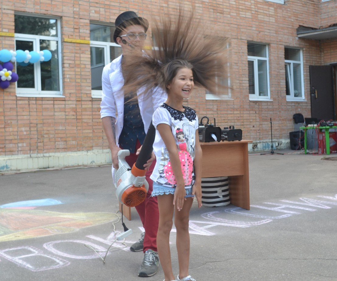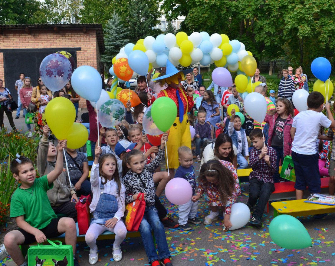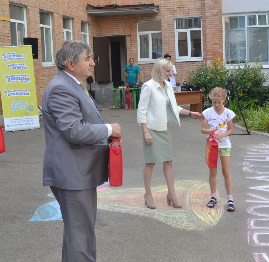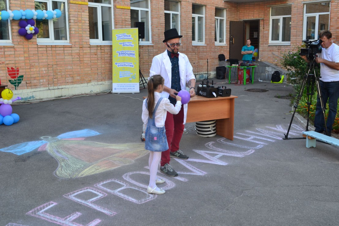 У входа будущих первоклассников встречала Тетушка Мудрость с загадками про школу, за правильный ответ ребята получали блокнотики и карандаши. Веселый Незнайка устраивал для ребятни забавные эстафеты и рисовал вместе с ними на асфальте яркое лето цветными мелками.