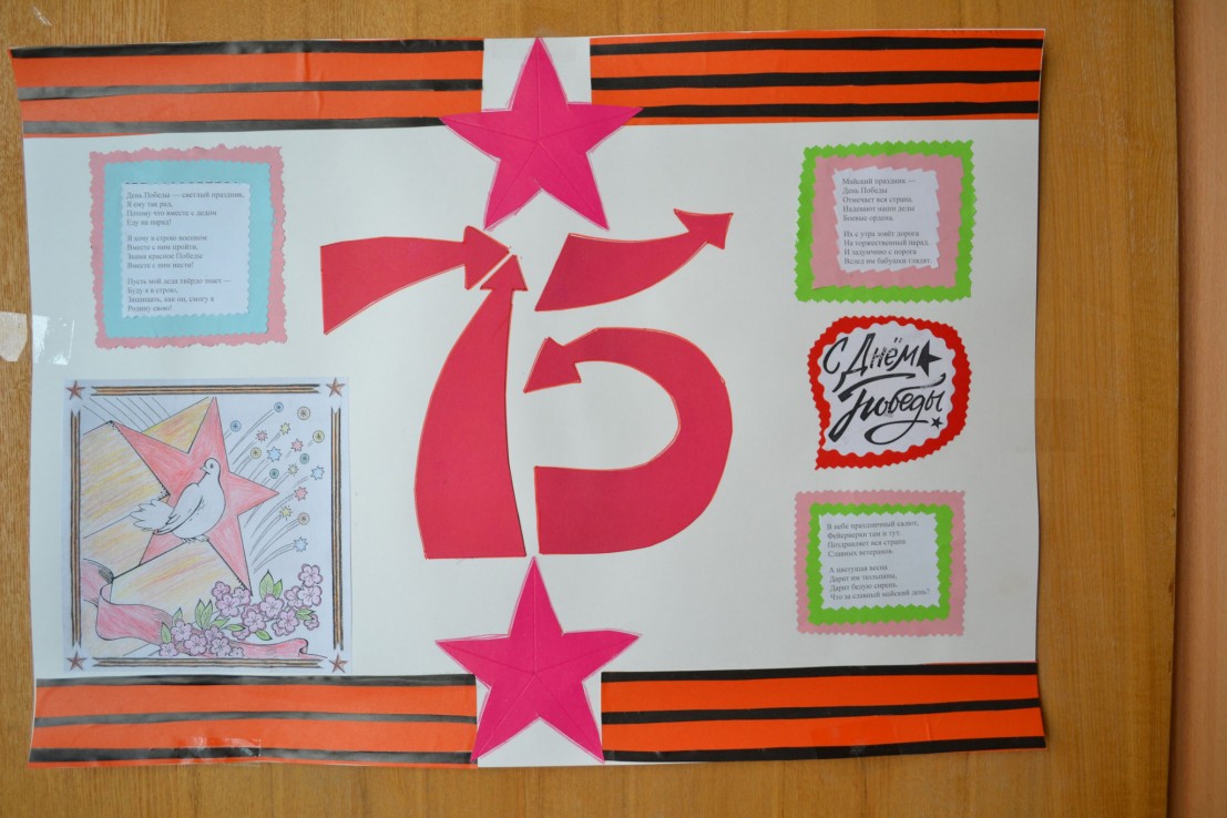 Не смотря на карантин и самоизоляцию, ребята участвовали в онлайн-конкурсе рисунков на тему: «Война. Победа. Память», приняли участие в акции, организованной фондом поддержки детей, находящихся в трудной жизненной ситуации «Города для детей поздравляют ветеранов». Ребята исполнили легендарную песню «День Победы». К празднику вместе с воспитателями дети активно украшали группы тематическими стенгазетами и плакатами.