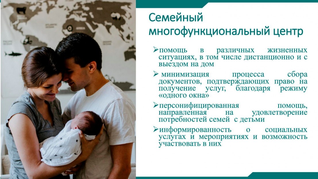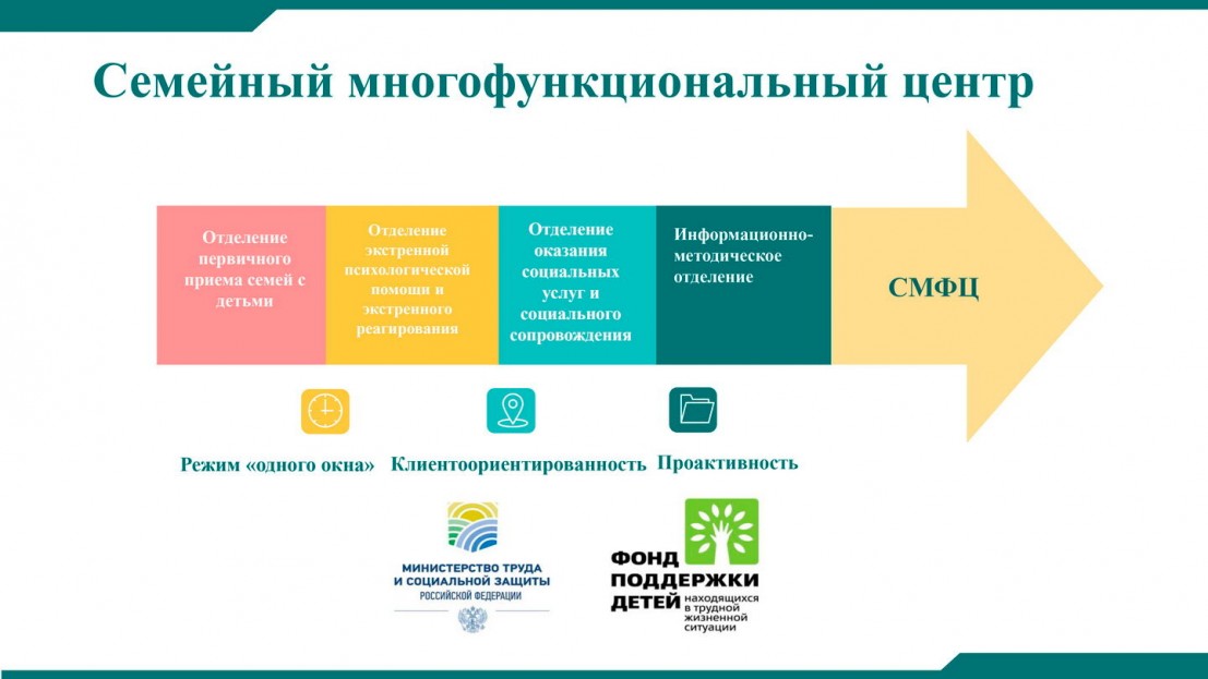 ????Семейные многофункциональные центры – это современный комплексный подход к социальному обслуживанию и сопровождению семей с детьми, нуждающихся в поддержке. Он включает приём в режиме «одного окна» обращения от семьи по самым разным проблемам, диагностику ситуации, разработку индивидуальной программы предоставления соцуслуг, консультации различных специалистов, мониторинг эффективности программы помощи. Эти и множество других социальных сервисов будут доступны для семей в одном месте – в Семейном МФЦ.