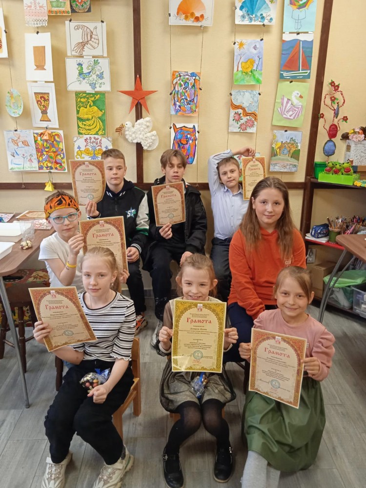13 мая в помещении студии детского творчества филиала «Согласие» (Маяковская д.1) состоялось вручение заслуженных грамот воспитанникам кружка художественного творчества за участие в Пасхальной выставке в Калужском театре юного зрителя.