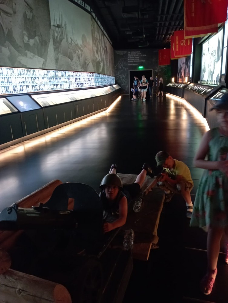 Дети с удовольствием разглядывали верхние своды Храма, которые украшены витражами с изображениями воинских орденов , а кому то были интересны образы святых и иконы. Любопытно было выяснить, какие военные события отражены во внутреннем убранстве Храма. Его стены украшают 44 мозаичные картины главных сражений , в которых принимали участие военные России. Затем посетили музей- галерею «Дорога памяти». С одной стороны в части залов представлена информация по событиям Великой Отечественной Войны , с другой – о людях отличившихся в военных действиях. Газетные вырезки, письма, исторические экспонаты, всё это дополняется интерактивными , звуковыми эффектами и кадрами хроники тех лет. Детям было непривычно передвигаться по залам со стеклянными полами, ниже которых располагается часть экспозиции ( в виде вещей тех времён), различные виды оружия , как советского, так и немецкого. В завершении экскурсии совершили прогулку по комплексу, побывали на «Поле Победы». Это историческая композиция, представляющая собирательный образ сражения под Москвой в 1941 году. Наши дети с удовольствием посидели в землянке, побегали в окопах, фотографировались на разной технике. Они получили массу удовольствия, эта поездка запомнится им надолго. Это потрясающее место силы, грандиозная работа, труд и Великая память для потомков .