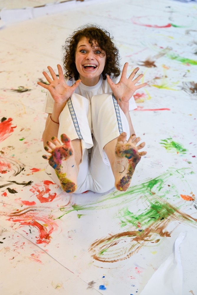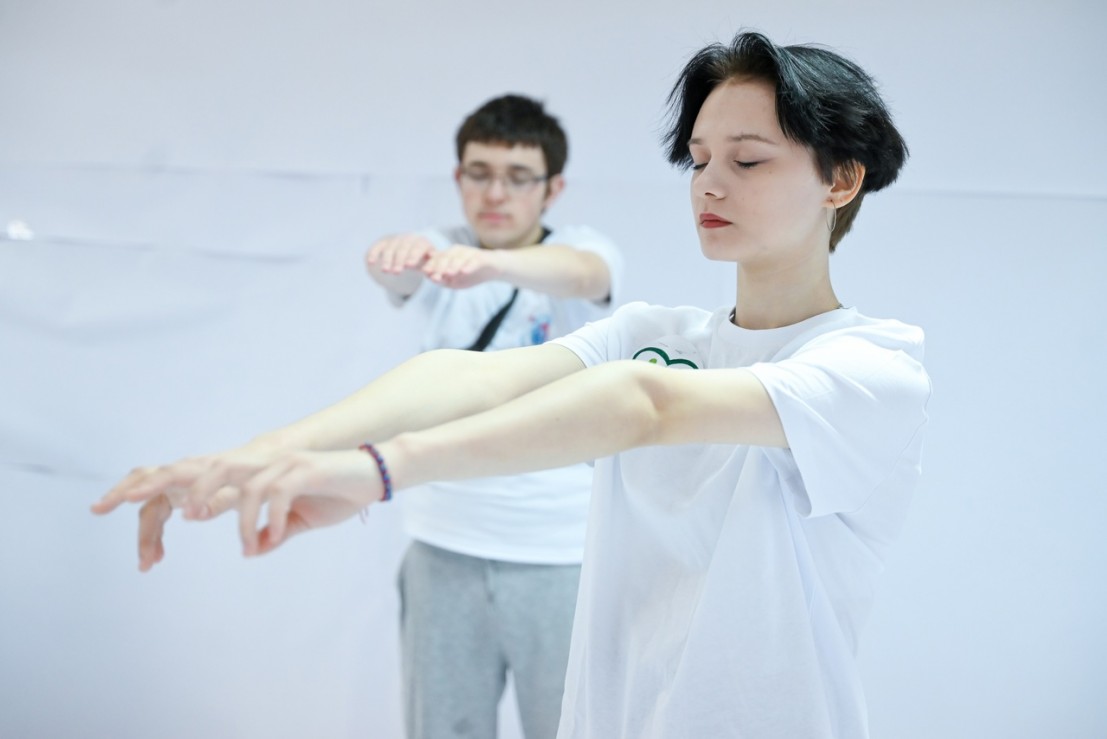С белого листа и босыми предложила нам начать арт-терапевтическое путешествие Евгения Талецкая, режиссер и хореограф, партнер НКО «Старт в будущее». Ожидание близкого праздника, предвкушение приятного сюрприза интриговало и немного тревожило ребят, что там за закрытой дверью зала. Так мы очутились в белой одежде в пустой бесцветной комнате, словно на другой планете.
