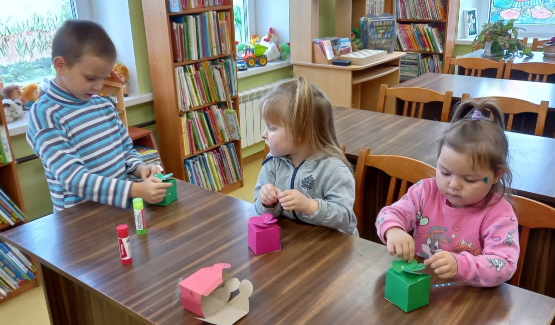 Вместе с сотрудниками библиотеки ребята путешествуют по сказкам, рисуют, лепят и мастерят различные поделки. В это раз дети своими руками изготовили красивые подарочные коробочки, а еще нарисовали замечательных зайчат! Время, проведённое в библиотеке, останется надолго в памяти детворы.