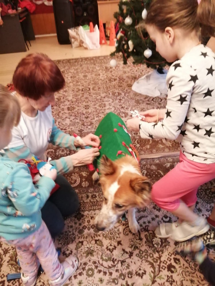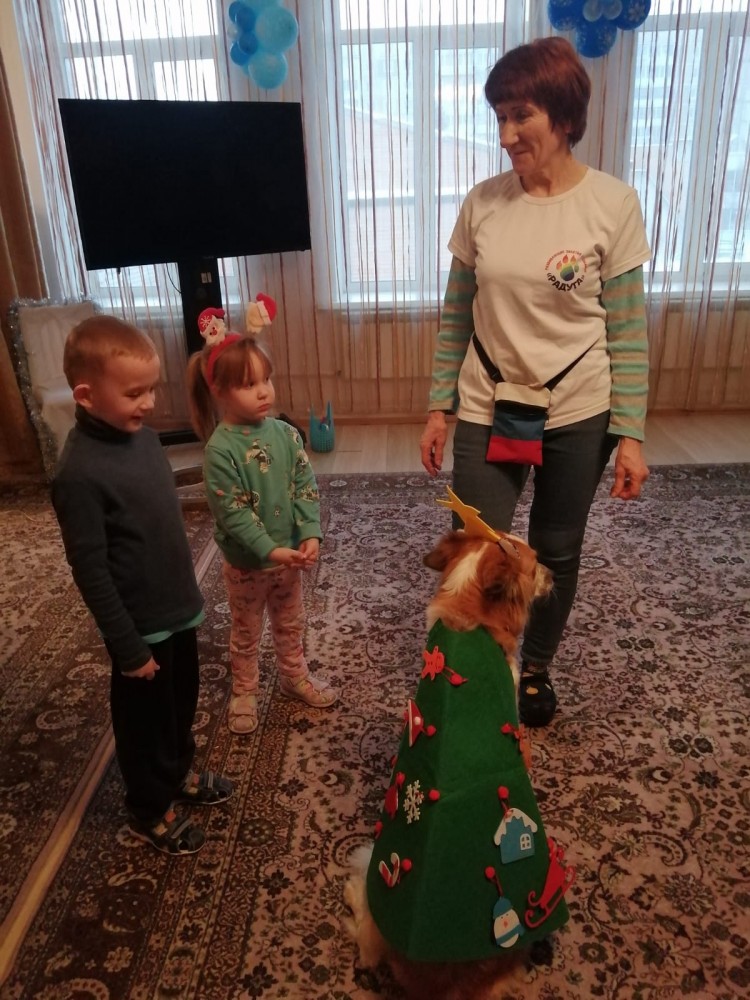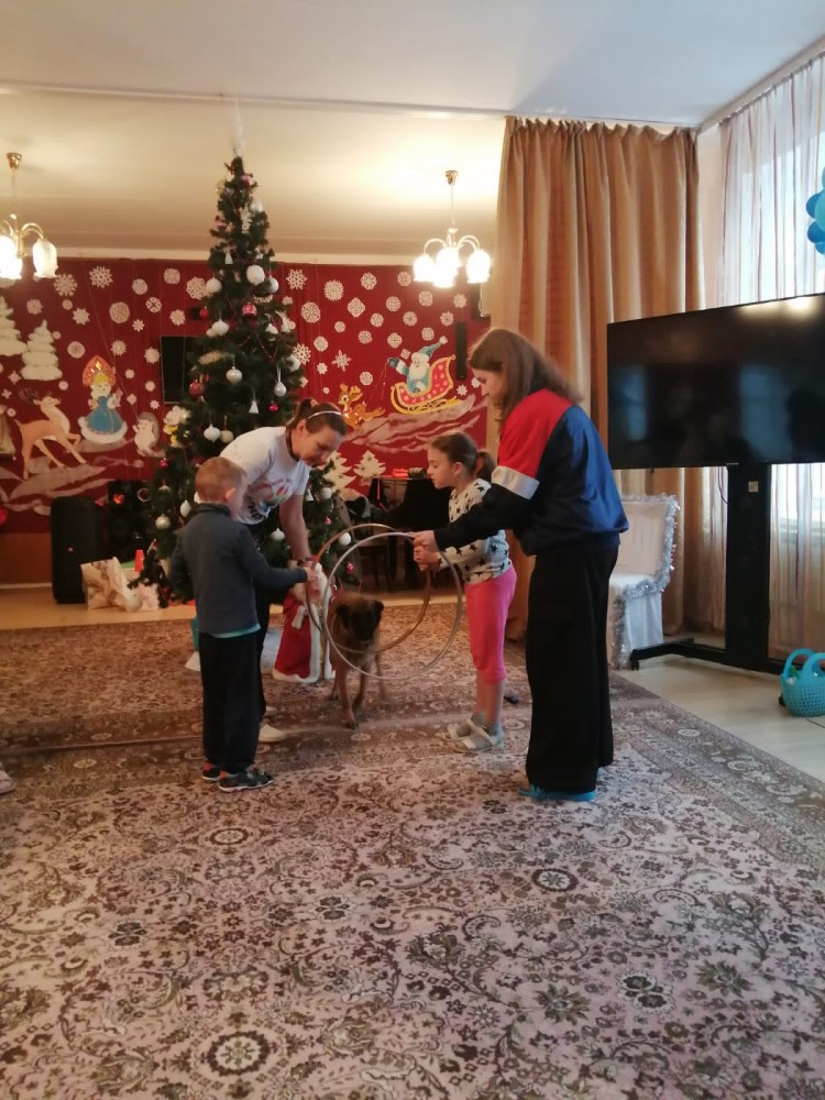 Дети поиграли с собаками, посмотрели их выступление, поучаствовали в дрессировке собак на полосе препятствий! Как без карнавальных костюмов в новогодние дни? Ребята одели одну собачку в ёлочку и украсили её, а другую нарядили в зайчика! Всем было весело и вкусно, так как "Пища жизни Обнинск" передала подарочки для всех ребят!!!