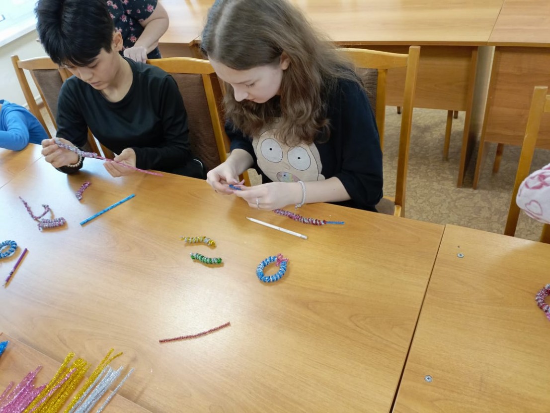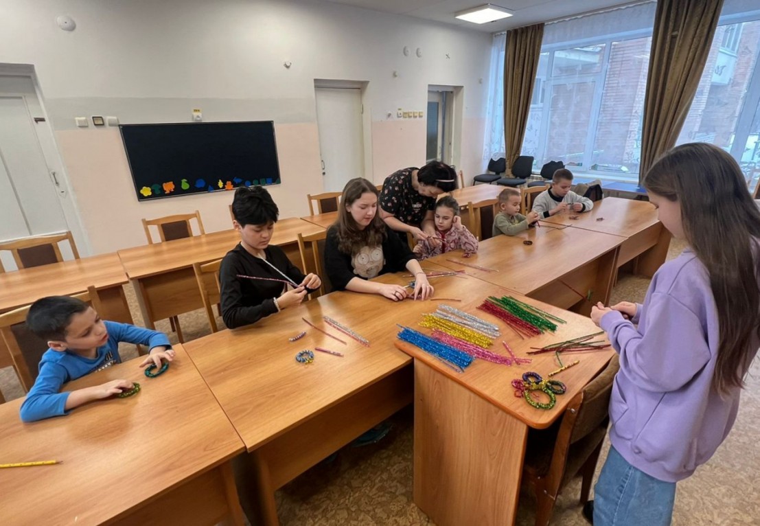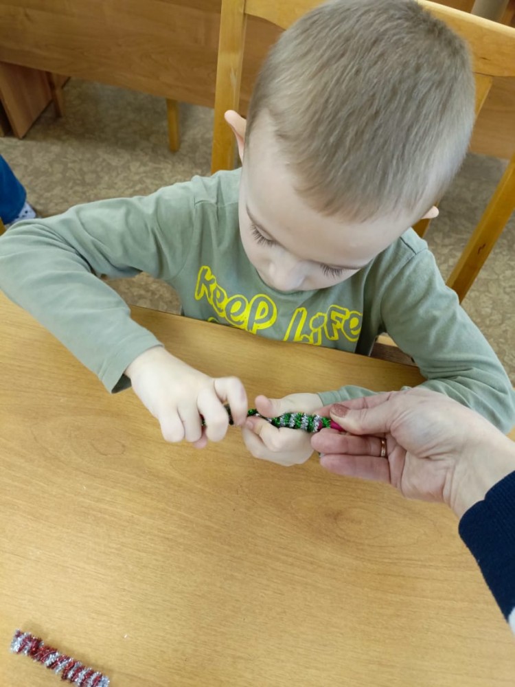 Начался новый год с просмотра новогодних фильмов и мультфильмов. В начале января в гости к ребятам приходила волонтер Ульяна, которая научила детей плести красивые новогодние браслеты-веночки.