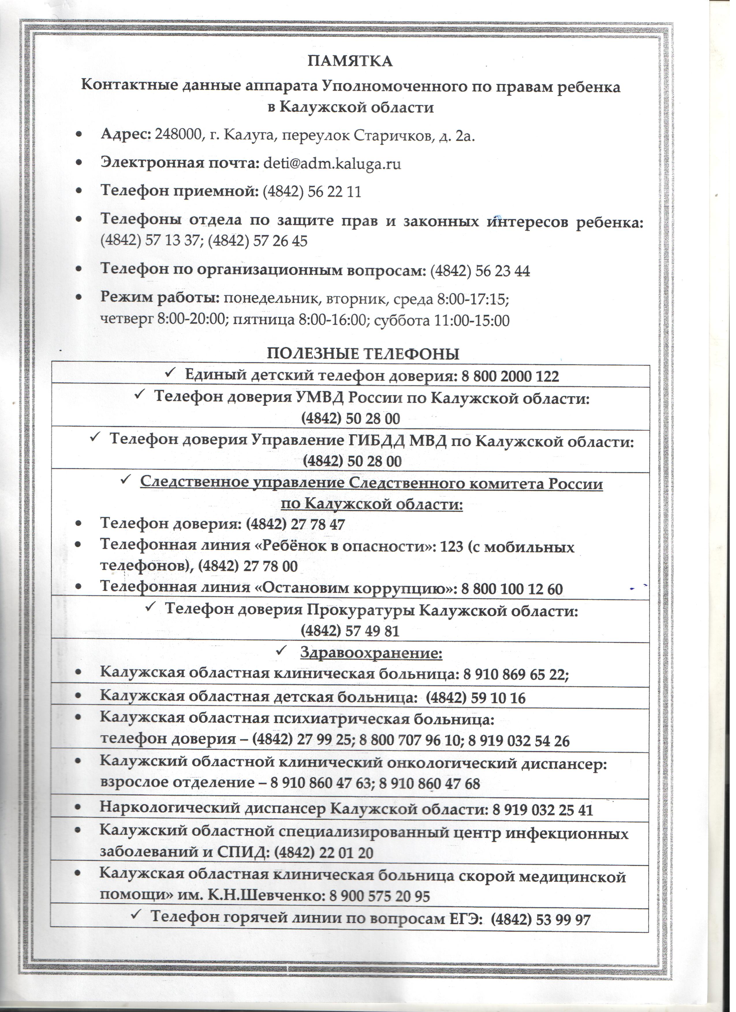 КОНТАКТНЫЕ ДАННЫЕ УПОЛНОМОЧЕННОГО ПО ПРАВАМ РЕБЕНКА В КАЛУЖСКОЙ ОБЛАСТИ